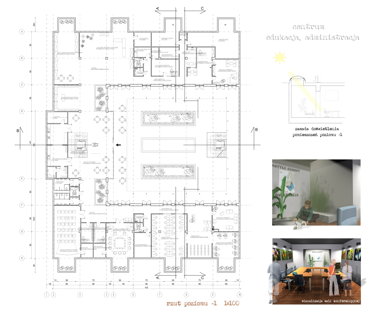 W strefie środkowej kondygnacji, oprócz komunikacji pionowej, ulokowałam kawiarnię z zapleczem, węzeł sanitarny. W pomieszczeniach w części podziemnej centrum, pozbawionych bezpośredniego dostępu światła dziennego zastosowałam świetliki. Budynek ma kształt litery U, a w części wewnętrznej, odkrytej - częściowo utwardzone patio z odrębną, wolnostojącą klatką schodową umożliwiającą komunikację pionową z patia na poziom terenu. Tam także, na murze oporowym od strony płd-wsch, przeznaczyłam miejsce na sezonowe wystawy np. zdjęć motyli.. Nieomal z każdego pomieszczenia z kondygnacji „-1” można wyjść na patio.