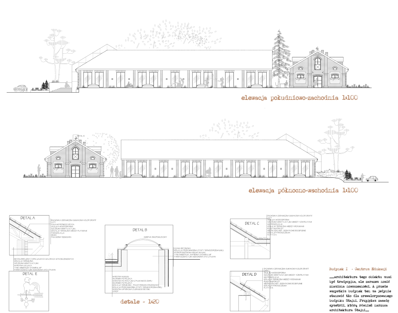 Projektując ten fragment zespołu, założyłam, że architektura tego obiektu musi być tradycyjna, ale zarazem nosić znamiona nowoczesności. A przede wszystkim budynek ten ma jedynie stanowić tło dla zrewaloryzowanego budynku Stajni. Przyjęłam zasadę symetrii, którą również narzuca architektura Stajni. Budynek ma dwie kondygnacje (oznaczone na rysunku „-1” i „0”). Jednak, zgodnie z zapisem Studium, aby nie przekroczyć gabarytów zabudowy historycznej oraz uzyskać oczekiwaną powierzchnię użytkową, kondygnację „-1” umieściłam poniżej poziomu terenu.