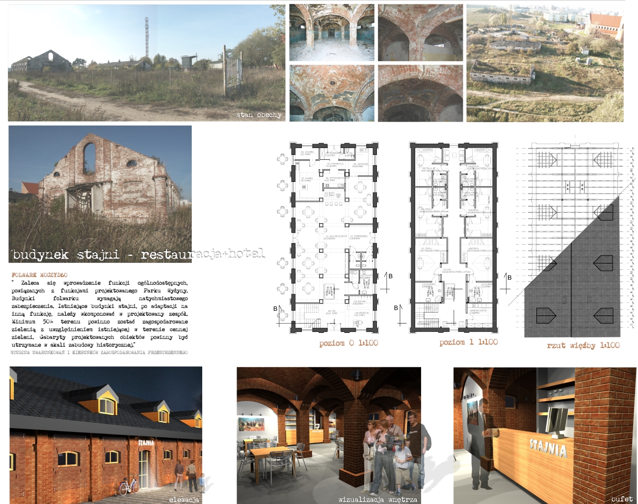 Budynek parterowy z poddaszem użytkowym, pochodzący z początku XIX w.; adaptacja na restaurację oraz część hotelową – pokoje gościnne na poddaszu. Komunikacja pionowa – klatka schodowa + winda dla niepełnosprawnych. Na dole, oprócz funkcji podstawowej, recepcja, szatnia, sanitariaty.