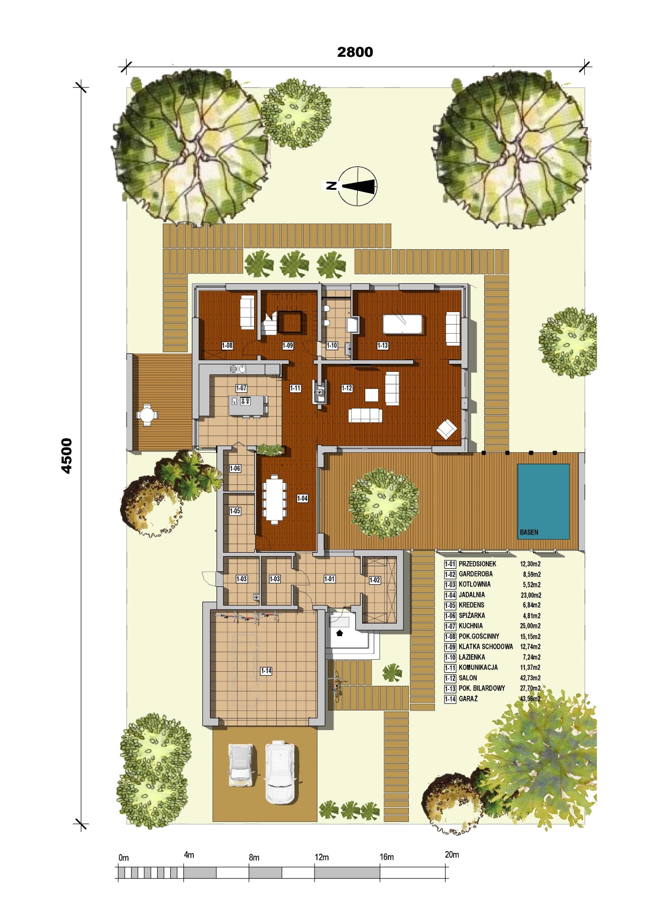 Dom z wewnętrznym patiem, na którym planuje się posadzenie centralnie drzewa - średniej wiekości brzoza - Betula pendula ’Youngii’ oraz aranżację niedużego basenu.