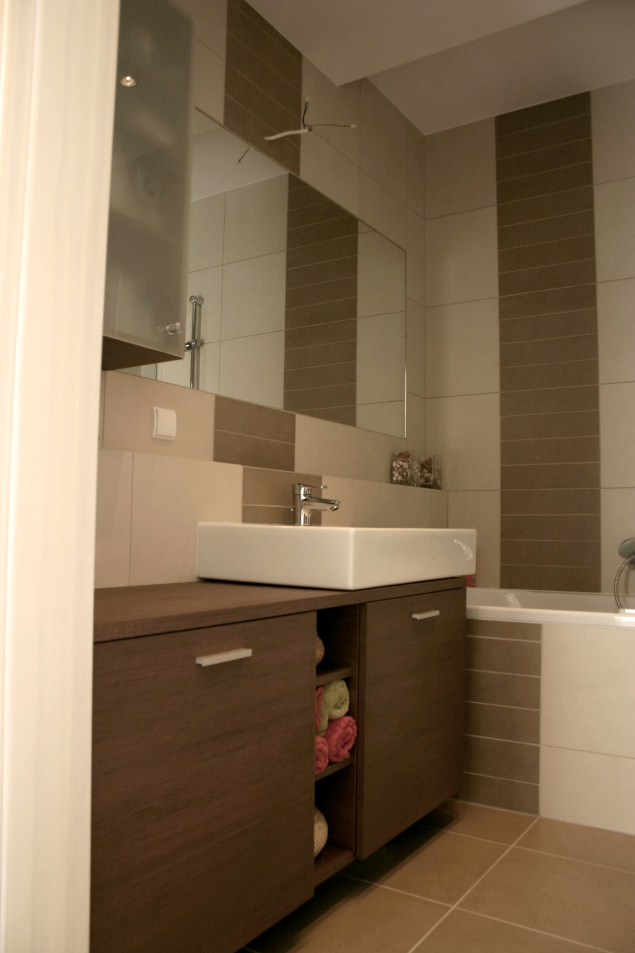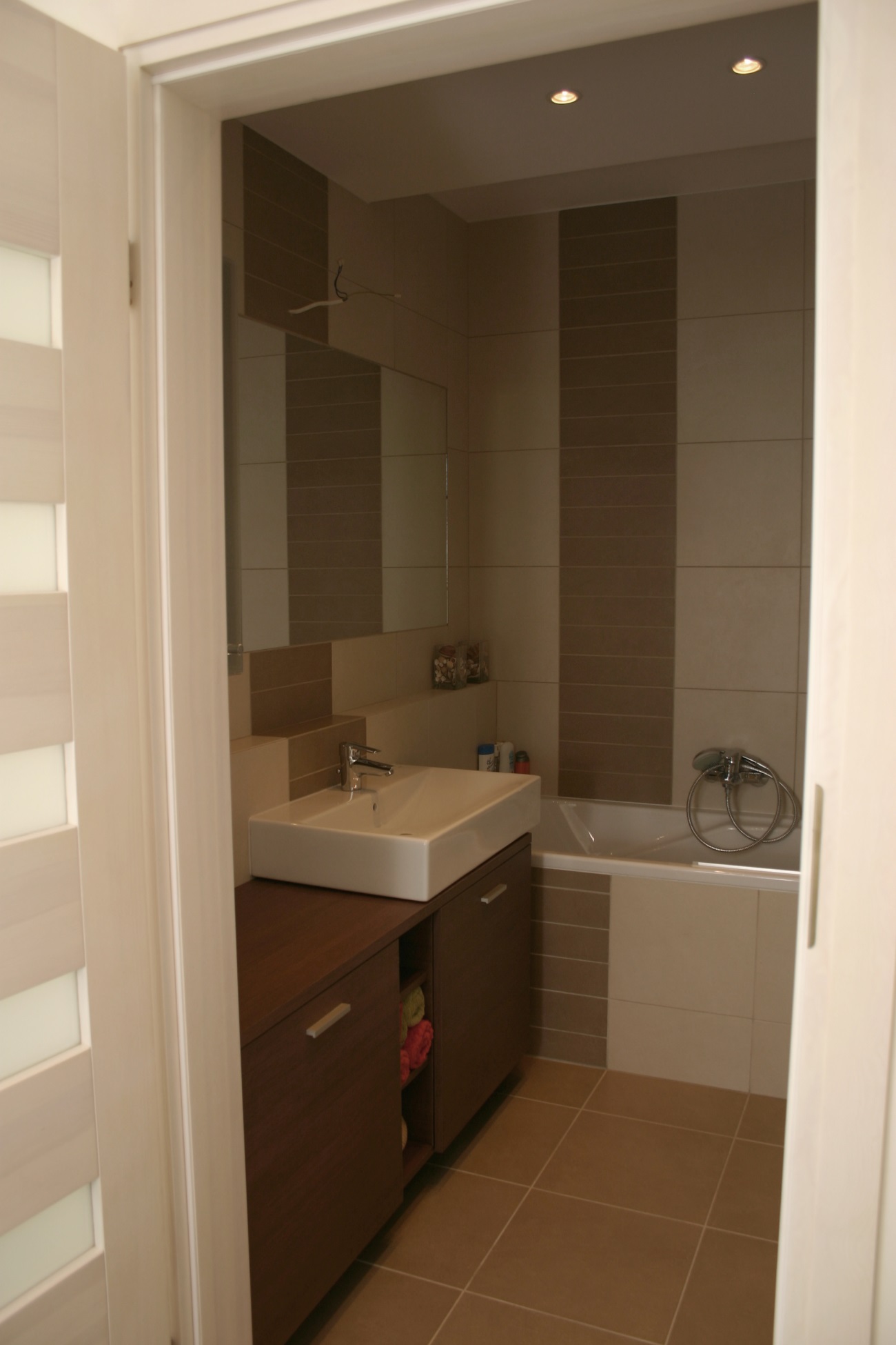 Mieszkanie na poddaszu z oknami kolankowymi, na warszawskich Kabatach. Całość utrzymana w jasnych barwach, z odrobiną "jeansu" w postaci gresu w kuchni.