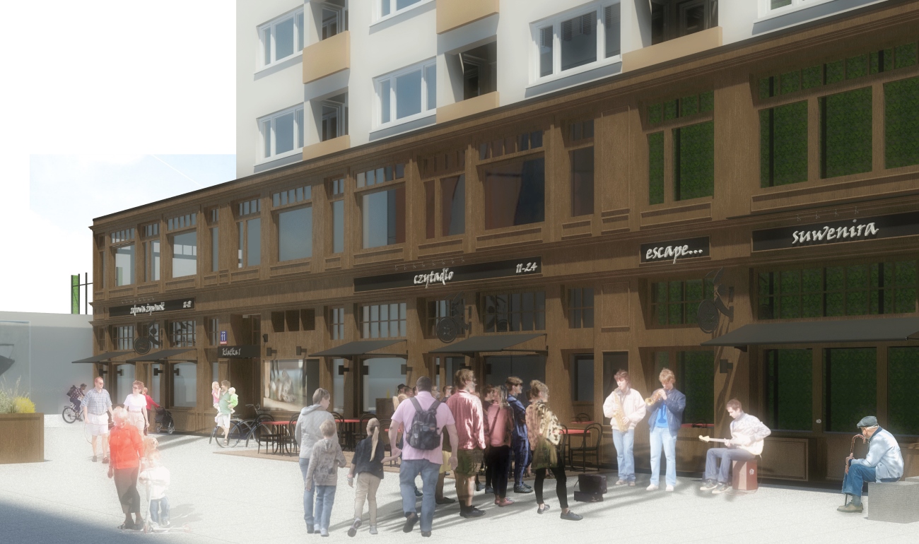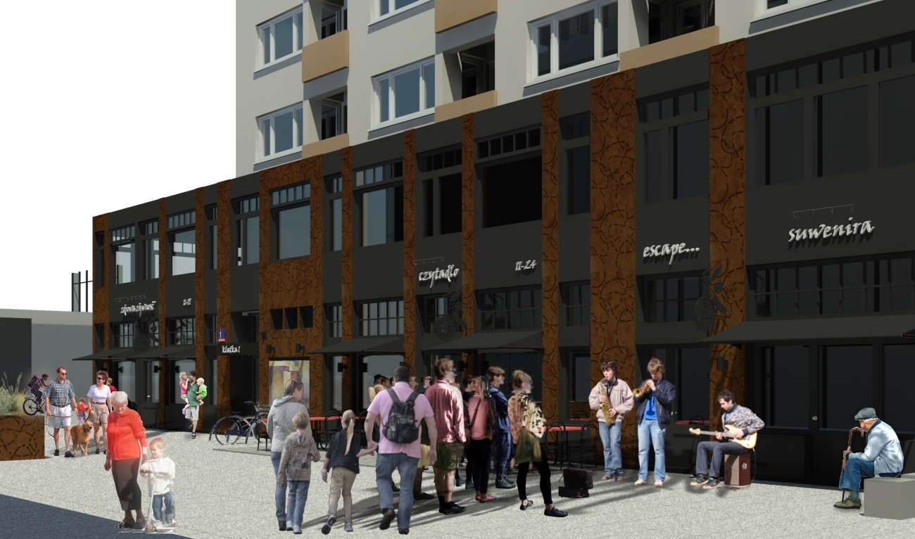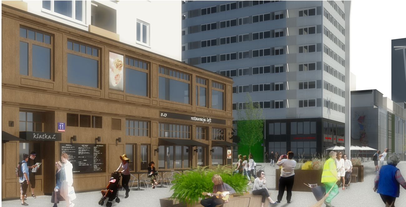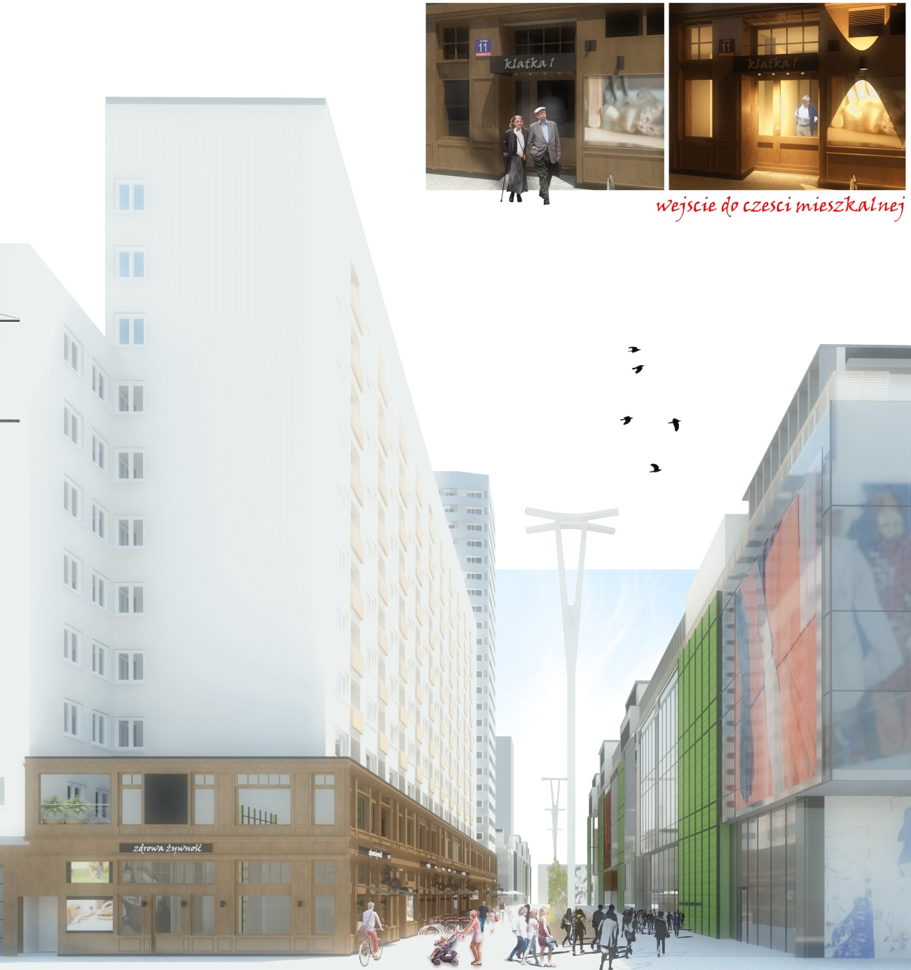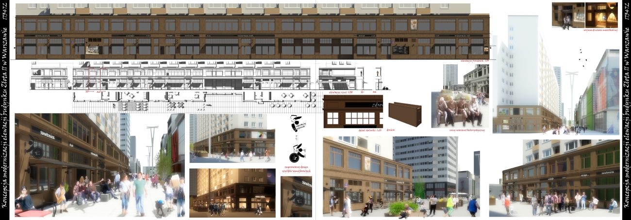 W koncepcji konkursowej należało uwzględnić przede wszystkim: - podziały elewacji - elementy detalu architektonicznego - kolorystykę i rozwiązania materiałowe dla elewacji oraz ślusarki; - standardy informacji wizualnej na elewacji oraz ewentualnie umieszczanych w przestrzeni pasażu Wiecha (szyldy, napisy, znaki informacyjne, neony itp); Uwaga:  Do zadań Uczestnika konkursu należy także decyzja czy w przestrzeni pasażu Wiecha należy umieszczać elementy mobilne związane z działalnością lokali użytkowych i najemców (np. ogródki kawiarniane, zieleń w donicach, różne formy reklamy i promocji, tarasy, sceny itp.). W przypadku, gdy Uczestnik konkursu uzna, iż elementy takie powinny być stosowane w przestrzeni pasażu Wiecha, wówczas w pracy konkursowej należy przedstawić standardy i przykłady tych elementów wraz z propozycja ich aranżacji w przestrzeni pasażu. 5) W koncepcji należy przeprowadzić analizę funkcji dla lokali z punktu widzenia estetyki budynku oraz funkcjonowania pasażu Wiecha i przedstawić propozycję zamienną dla obecnie istniejących funkcji. 6) Dopuszcza się możliwość zabudowy lub/i aranżacji całej przestrzeni tarasu nad kondygnacją O w poziomie kondygnacji +1 (antresola) do wysokości tej kondygnacji. Uczestnik konkursu może także zaproponować pozostawienie tej przestrzeni bez zabudowy lub inny sposób aranżacji oraz likwidację istniejących obecnie na dwóch fragmentach zabudów. 7) Wszystkie propozycje projektowe powinny nadać elewacji spójność i ujednolicony charakter oraz zapewnić poprawę funkcjonalności oraz estetyki tego fragmentu pasażu Wiecha. 8) Budynek przy Złotej 11 znajduje się w obszarze stanowiącym dobro kultury współczesnej tj. zespół architektoniczno-urbanistyczny Ściana Wschodnia wzniesiony w latach 1962-1969 według projektu Zbigniewa Karpińskiego i Jana Klewina. W związku z powyższym istotne jest zachowanie istotnych i charakterystycznych elementów tego układu zarówno pod względem urbanistycznym jak i architektonicznym stanowiących o charakterze miejsca.