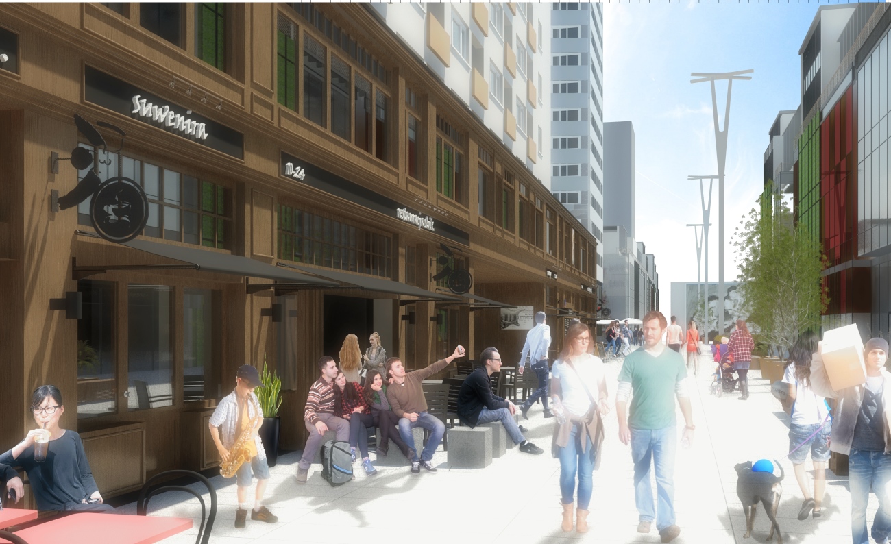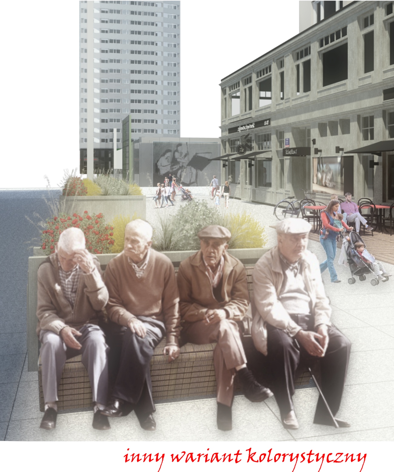 Inspirując się rozwiązaniami ze stolic europejskich pierwszy i niezgłoszony do konkursu pomysł ocieplenia przestrzeni ścisłego Śródmieścia Warszawy. Wykończenie - drewno.