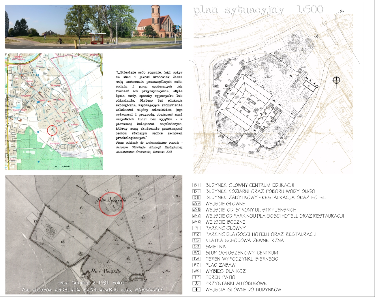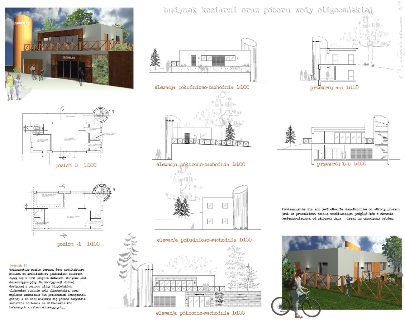 Wykorzystuje rzeźbę terenu. Jego architektura odbiega od architektury pozostałych obiektów, łączy się z nimi jedynie detalami. Budynek jest dwukondygnacyjny. Na kondygnacji dolnej, dostępnej z poziomu ulicy Stryjeńskich, ulokowałam studnię wody oligoceńskiej oraz zaplecze techniczne dla pomieszczeń kondygnacji górnej, a na niej znajduje się przede wszystkim koziarnia obliczona na kilkanaście kóz hodowanych w celach edukacyjnych. W narożniku budynku od strony wschodniej ulokowałam klatkę schodową w formie ściętego walca wykonanego w technologii szkieletowej oraz oszalowanego drewnem. W górnej części walca przewidziałam miejsce na zorganizowanie gołębnika – dla gołębi hodowanych na terenie Folwarku od lat. Zakładam, że obsługą kóz, gołębi zajmowałaby się ta sama osoba. Dla tegoż pracownika przewidziałam małe zaplecze socjalne na kondygnacji dolnej budynku. Na kondygnacji górnej znajduje się również pomieszczenie gospodarcze, które może być wykorzystywane jako zaplecze ogrodnika (kosiarka, łopaty itp.) oraz WC dostępne dla zwiedzających (przystosowane dla niepełnosprawnych). Budynek ten wkomponowany jest w ogrodzenie i ma z nim stanowić całość. Pomieszczenie dla kóz jest otwarte dwustronnie: od strony pn-wsch jest to przeszklona ściana umożliwiająca podgląd kóz w okresie jesienno-zimowym, od płd-zach okna + drzwi na ogrodzony wybieg.