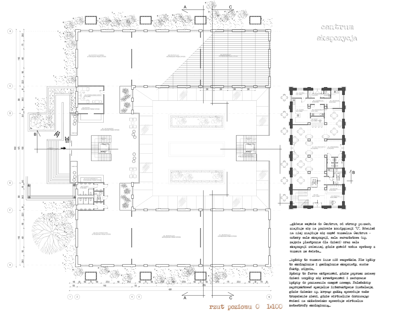 W strefie środkowej kondygnacji, oprócz komunikacji pionowej, ulokowałam kawiarnię z zapleczem, węzeł sanitarny. W pomieszczeniach w części podziemnej centrum, pozbawionych bezpośredniego dostępu światła dziennego zastosowałam świetliki. Budynek ma kształt litery U, a w części wewnętrznej, odkrytej - częściowo utwardzone patio z odrębną, wolnostojącą klatką schodową umożliwiającą komunikację pionową z patia na poziom terenu. Tam także, na murze oporowym od strony płd-wsch, przeznaczyłam miejsce na sezonowe wystawy np. zdjęć motyli.. Nieomal z każdego pomieszczenia z kondygnacji „-1” można wyjść na patio.