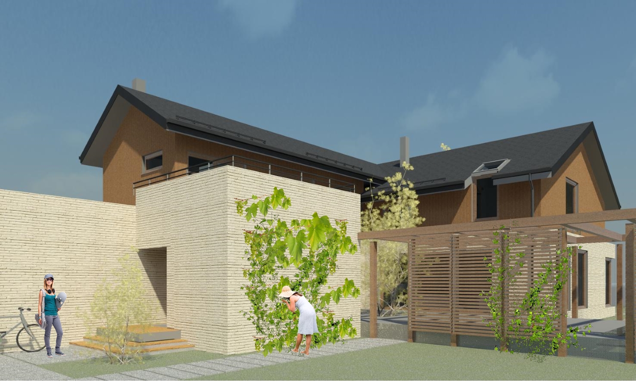 Dom z wewnętrznym patiem, na którym planuje się posadzenie centralnie drzewa - średniej wiekości brzoza - Betula pendula ’Youngii’ oraz aranżację niedużego basenu.