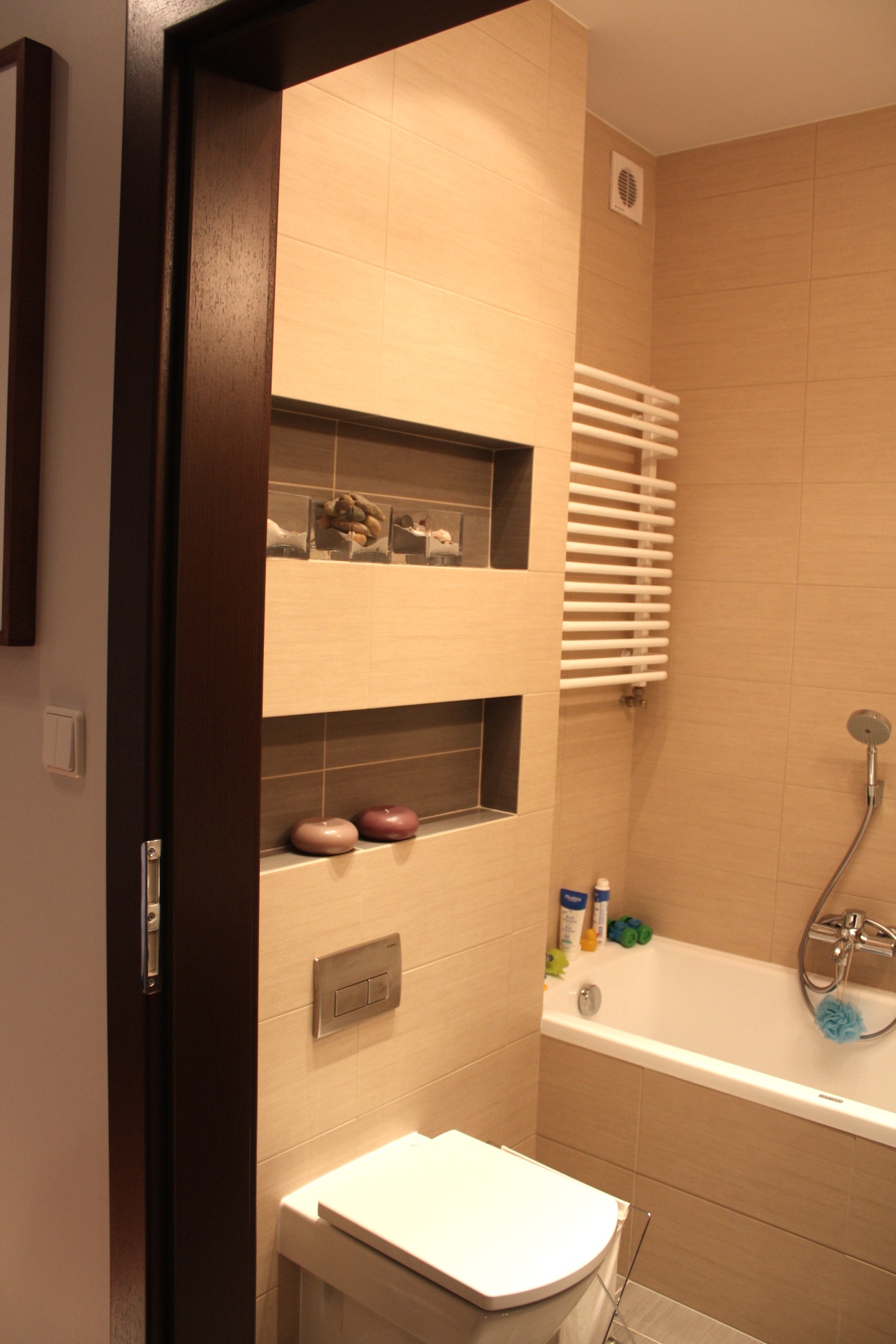 mniejsza łazienka, z wanną; asymetryczna aranżacja okolic umywalki