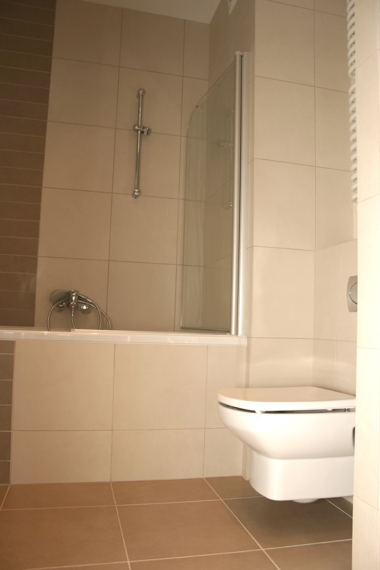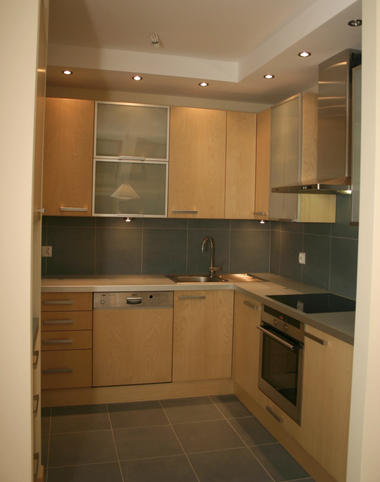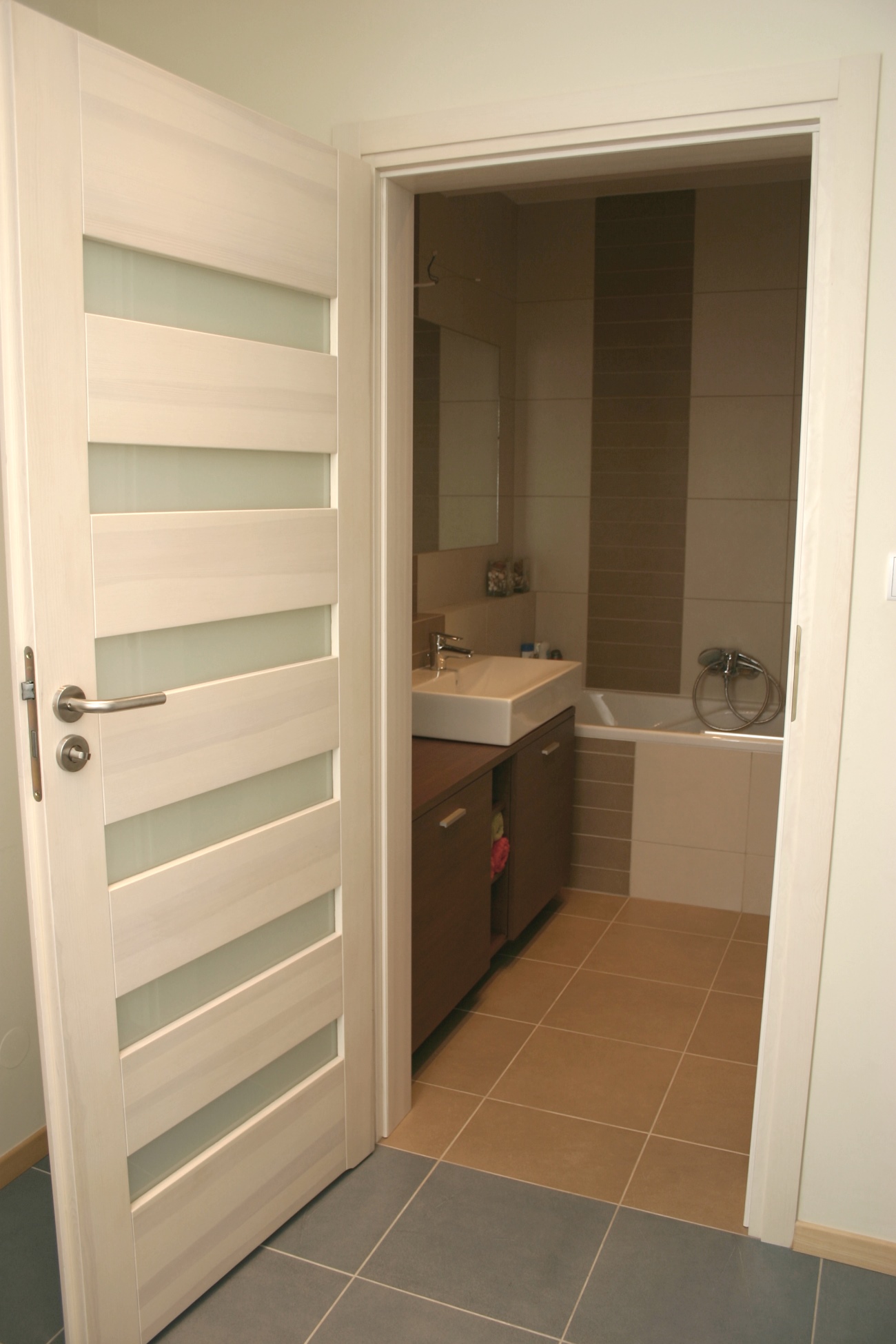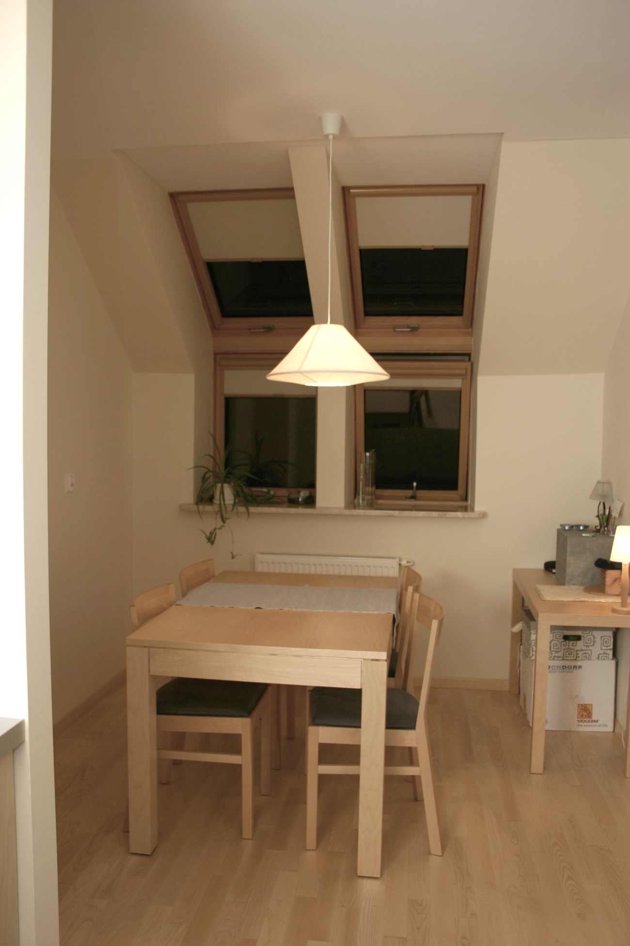 Mieszkanie na poddaszu z oknami kolankowymi, na warszawskich Kabatach. Całość utrzymana w jasnych barwach, z odrobiną "jeansu" w postaci gresu w kuchni.