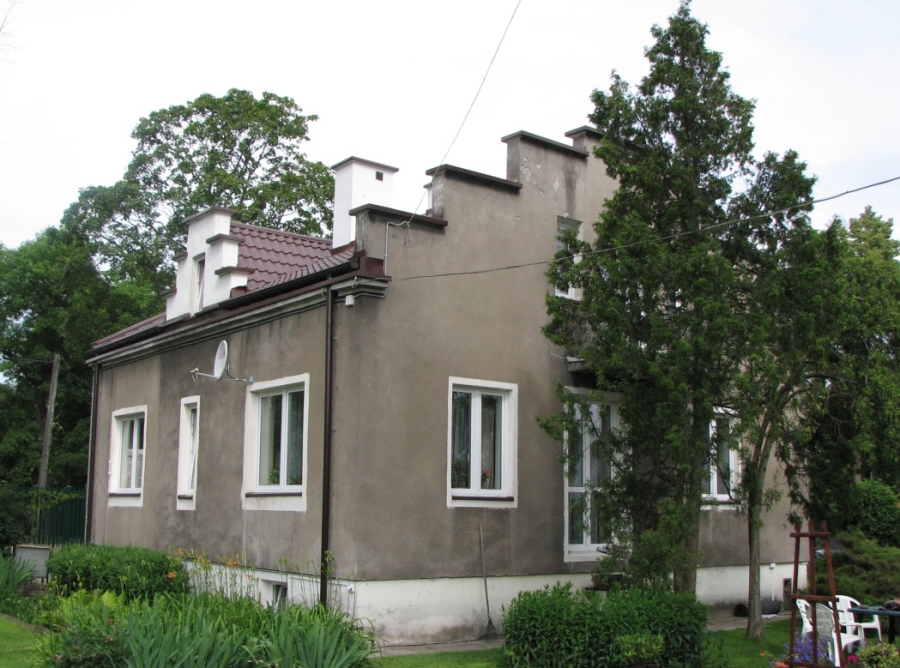 Istniejący budynek wybudowany został w latach 50-tych XX wieku. Stoi w ostrej granicy działki. Jest to budynek dwukondygnacyjny – parter + poddasze użytkowe, zaprojektowany na planie kwadratu, podpiwniczony. Wyniesienie parteru ponad teren wynosi ok. 1,15m. Obiekt charakteryzuje się prostą formą, dachem o kacie nachylenia ok. 30 stopni, z lukarnami z trzech stron. Budynek wykończony w tynku, dach pokryty blachodachówką . W zachodniej i północnej granicy działki znajdują się budynki gospodarcze, których przeznaczenie ma zostać zmienione na funkcję mieszkalną i, które zostaną nadbudowane i włączone do nowoprojektowanego budynku. W ekspertyzie konstrukcyjnej stanu istniejącego dokonano analizy, jaki jest stan techniczny istniejącego budynku i pomieszczeń gospodarczych, które ściany zostaną wykorzystane, i w jaki sposób należy poprawić ich stan techniczny. Pozostałe ściany będą musiały zostać rozebrane, ponieważ kolidują z projektowaną inwestycją.