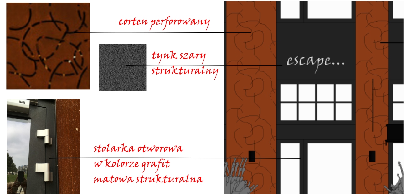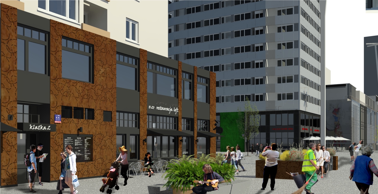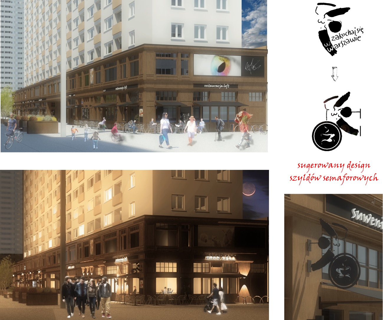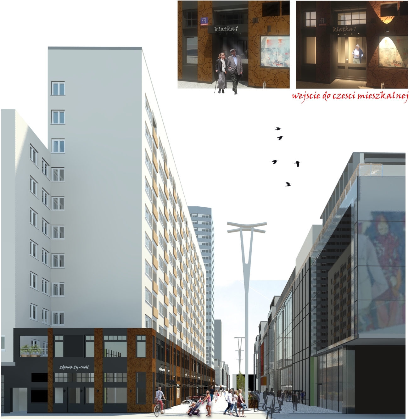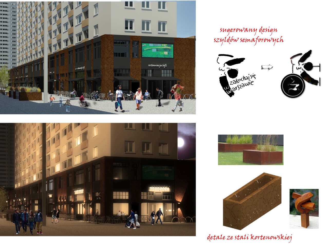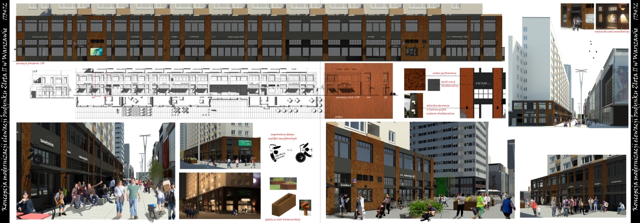 W koncepcji konkursowej należało uwzględnić przede wszystkim: - podziały elewacji - elementy detalu architektonicznego - kolorystykę i rozwiązania materiałowe dla elewacji oraz ślusarki; - standardy informacji wizualnej na elewacji oraz ewentualnie umieszczanych w przestrzeni pasażu Wiecha (szyldy, napisy, znaki informacyjne, neony itp); Uwaga:  Do zadań Uczestnika konkursu należy także decyzja czy w przestrzeni pasażu Wiecha należy umieszczać elementy mobilne związane z działalnością lokali użytkowych i najemców (np. ogródki kawiarniane, zieleń w donicach, różne formy reklamy i promocji, tarasy, sceny itp.). W przypadku, gdy Uczestnik konkursu uzna, iż elementy takie powinny być stosowane w przestrzeni pasażu Wiecha, wówczas w pracy konkursowej należy przedstawić standardy i przykłady tych elementów wraz z propozycja ich aranżacji w przestrzeni pasażu. 5) W koncepcji należy przeprowadzić analizę funkcji dla lokali z punktu widzenia estetyki budynku oraz funkcjonowania pasażu Wiecha i przedstawić propozycję zamienną dla obecnie istniejących funkcji. 6) Dopuszcza się możliwość zabudowy lub/i aranżacji całej przestrzeni tarasu nad kondygnacją O w poziomie kondygnacji +1 (antresola) do wysokości tej kondygnacji. Uczestnik konkursu może także zaproponować pozostawienie tej przestrzeni bez zabudowy lub inny sposób aranżacji oraz likwidację istniejących obecnie na dwóch fragmentach zabudów. 7) Wszystkie propozycje projektowe powinny nadać elewacji spójność i ujednolicony charakter oraz zapewnić poprawę funkcjonalności oraz estetyki tego fragmentu pasażu Wiecha. 8) Budynek przy Złotej 11 znajduje się w obszarze stanowiącym dobro kultury współczesnej tj. zespół architektoniczno-urbanistyczny Ściana Wschodnia wzniesiony w latach 1962-1969 według projektu Zbigniewa Karpińskiego i Jana Klewina. W związku z powyższym istotne jest zachowanie istotnych i charakterystycznych elementów tego układu zarówno pod względem urbanistycznym jak i architektonicznym stanowiących o charakterze miejsca.